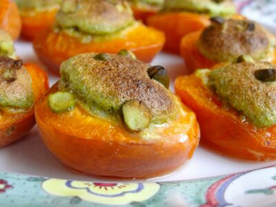 De petits macarons à la pistache sont venus se nicher dans le cœur de délicieux abricots de jardin…
