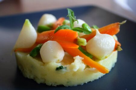 Cette fois ça y est, on ne l’attendait plus et pourtant le printemps est bel et bien arrivé aujourd’hui dans le nord de la France ! Voici pour l’occasion une petite recette très simple et hautement printanière, pour profiter des légumes primeurs qui sont enfin arrivés sur les étals. Les carottes et navets sont glacés sans miel ni sucre, pour garder leur saveur intacte, et la verveine apporte une note fraîche et herbacée particulièrement printanière, qui sublime la purée de rattes. Un accompagnement parfait pour un filet mignon de porc ou une volaille, mais ce plat de légumes se suffit à lui même, pour un repas du soir léger et végétarien.
