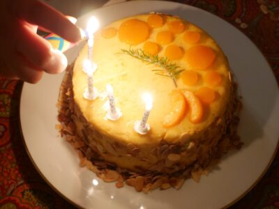 On peut utiliser le reste de purée de fruits pour la décoration du gâteau, en y incorporant à chaud 2 feuilles de gélatine et en coulant ce « miroir » dans un récipient en verre, où l’on pourra ensuite découper des formes une fois gélifié.