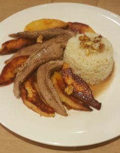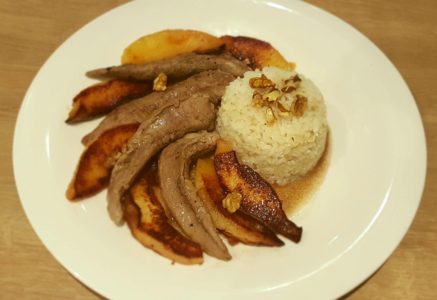 Servir les aiguillettes avec les coings, la sauce, quelques noix concassées, et accompagner le tout de riz blanc.