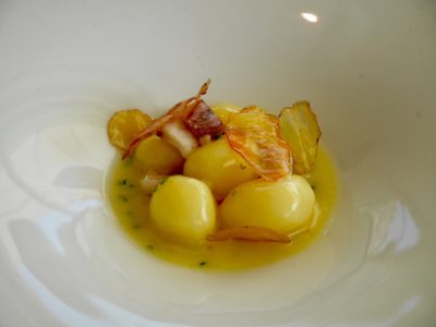 L’entrée suivante est bouleversante de simplicité : pommes de terre du jardin, anguille fumée, sauce cabillaud et ciboulette. Tout simplement magnifique.