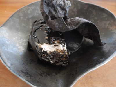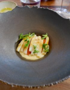 On nous amène ensuite un chou rave entier, qui renferme une fraîcheur de coquillages, sauce « leche de tigre ». L’ensemble est particulièrement subtil et savoureux, la réussite tenant selon moi au dosage parfait des saveurs (iode des coquillages, douceur du lait de coco, présence du piment qui reste discrète, contraste du végétal…