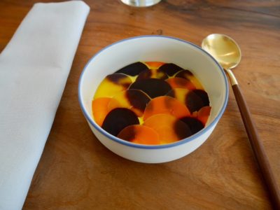 pâte de fruits gingembre… aucune entorse à la règle, la racine est partout, mais l’on regrette tout de même qu’il n’y ait pas un peu plus de créativité. Par exemple, le sorbet carotte a effectivement bien le goût de carotte, mais… c’est tout! Du jus de carotte glacé : on reste un peu sur notre faim pour un restaurant triplement étoilé.