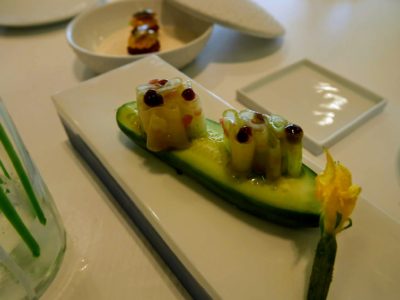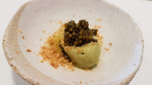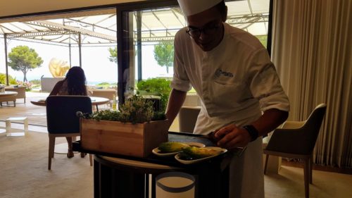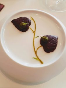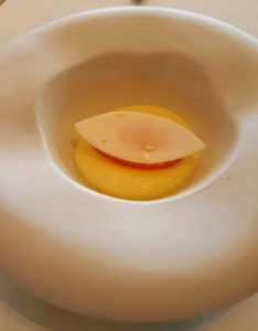 Le chef lui-même vient en salle pour servir cette première entrée particulièrement visuelle qui met à l’honneur la criste marine et sa saveur toute particulière que nous découvrons avec délectation…