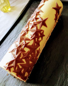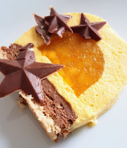 Evidemment il s’agit d’une recette un peu technique pour laquelle il vaut mieux avoir un moule adapté (j’ai utilisé un moule de la marque Silikomart avec un petit décor étoiles en chocolat), mais on peut aussi couler les différentes préparation dans un moule à cake qu’on aura préalablement chemisé de film pour faciliter le démoulage, ou bien choisir une autre forme en utilisant par exemple un moule à cheesecake. Les proportions et étapes des différentes préparations sont ci-dessous. Dans l’ordre, il faut préparer l’insert mangue-passion (en trouvant un moule adapté, le laisser prendre plusieurs heures au frais ou au congélateur, puis la dacquoise et l’insert praliné feuilletine, et enfin la mousse. Le dressage se fait en coulant d’abord la mousse aux 2/3 du moule, puis en déposant très délicatement l’insert avant de verser à nouveau de la mousse puis de terminer avec la dacquoise-praliné. Une fois le moule bien filmé il faut laisser prendre la buche plusieurs heures, voire plusieurs jours au congélateur. Il n’y aura plus qu’à la laisser décongeler au moins 5h avant de la démouler délicatement, et de la servir!