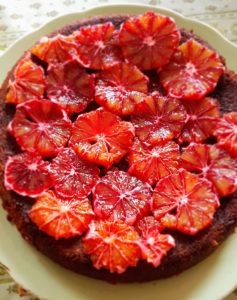 J’ai choisi de la réaliser avec les merveilleuses oranges sanguines d’Italie de la variété Moro que l’on trouve en ce moment, et de recouvrir le gâteau de lamelles d’orange pour ajouter un peu de fraîcheur…