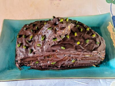 Pour dresser la bûche, découper le biscuit de Savoie en trois rectangles égaux, les imbiber au pinceau avec 2 cuillères à soupe de kirsch dilué dans un peu d’eau, et monter le gâteau en alternant les couches de biscuit et la crème à la pistache. Pour encore plus de gourmandise, on peut aussi ajouter du praliné pistache à l’une des couches, comme je l’ai fait pour ma bûche de Noël.
